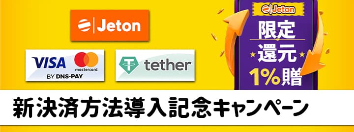 ジパングカジノおよび姉妹カジノのカジノジャンボリー、同じくラッキーベイビーにて、『Jeton(ジェットオン)』や『クレジットカード』、『仮想通貨(USDT)』など多数の決済手段が導入されました。