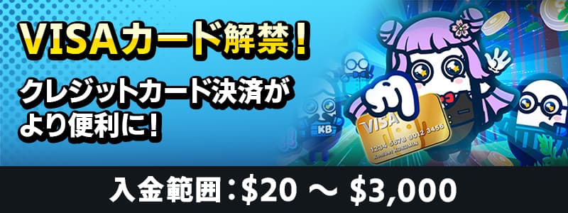 VISAカードをお持ちの方は、より便利で安全に入金できるようになったクレジットカード決済で、オンラインカジノライフを満喫しましょう。