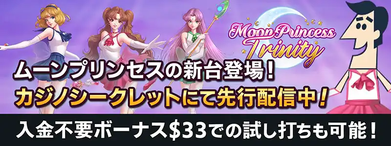 カジノシークレットの「MoonPrincessTrinity」は無料プレイもできますので、先行配信された最新機種をお試しでプレイして気に入ったら本格的に遊ぶ、というのもいいかもしれません。ぜひこの機会にプレイして見てください。