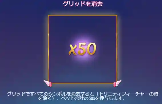 グリッドで全てのシンボルを消去するとべット額の50倍の配当となります。