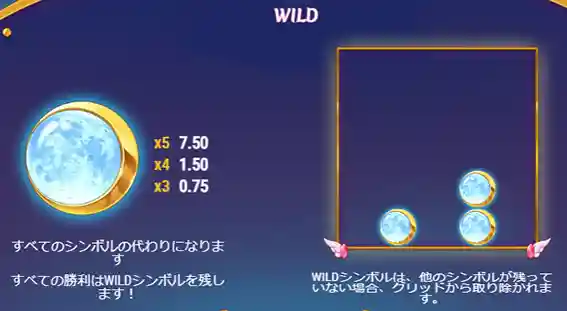 他のシンボルが残っていない状態でWILDシンボルのみがグリッドに残った場合、全てのWILDシンボルは消去され全消去状態になります。