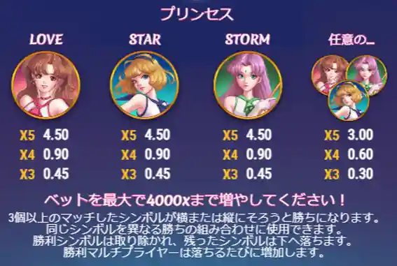 ムーンプリンセストリニティの最大配当倍率は4,000倍です。シリーズの中では一番小さく設定されていますが、平均RTPが他のシリーズとほぼ同じ94.20%であることから、あまり波が激しくないものと予想されます。