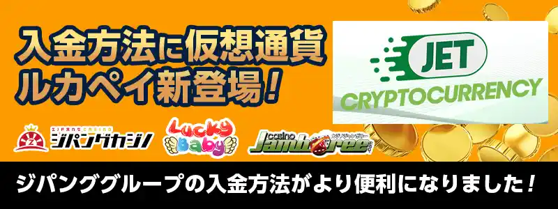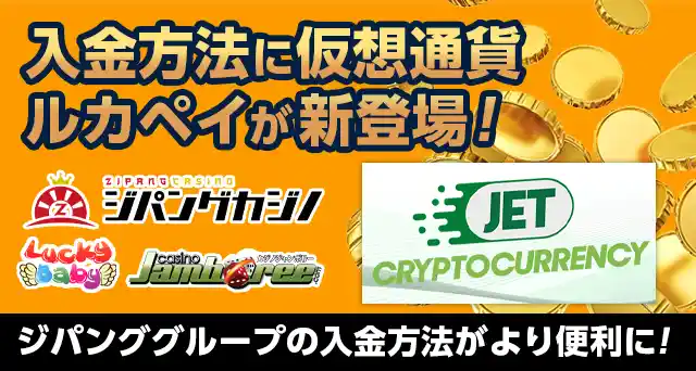 ジパングカジノとその姉妹カジノのラッキーベイビー、そしてカジノジャンボリーのジパング系列カジノにて、『ルカペイ(仮想通貨)』が新たな入金方法として利用可能になりました。