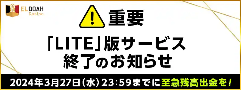 エルドアカジノにて、2024年3月27日 (水) 23:59 に「LITE版」が廃止されます。