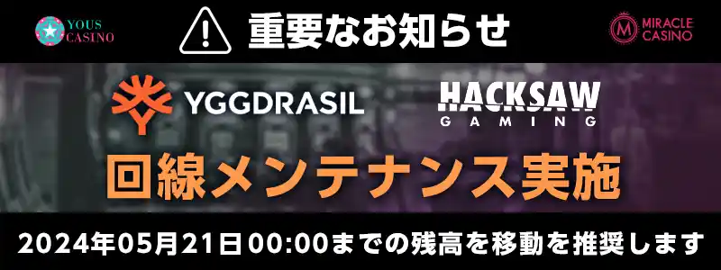 ユースカジノおよび、ミラクルカジノにて、人気プロバイターの『YGGdrasil』と『Hacksaw』2社のゲームを対象に回線変更のメンテナンスが実施されます。