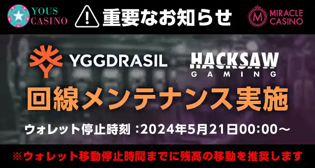 メンテナンス後の「リベートボーナスシステム」は、残高よりボーナス分を除いたキャッシュ分を、プレイした総ベット額を既定のボーナス率で算出します。リベートボーナスの適用は2024年5月7日の午前中が予定されています。